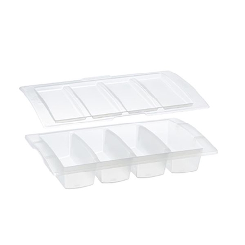 Practical Food Box with 4 compartments with snugly fitting, stackable lid to help with compact and safe storage of separated ingredients ready for plating or use in buffet settings.